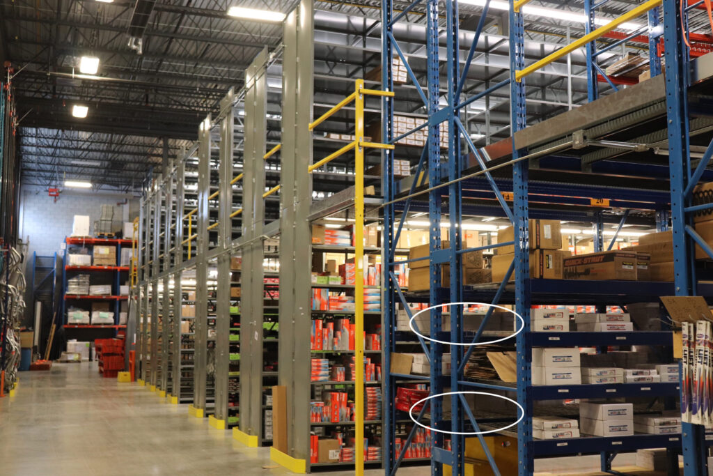 Metalware was able to recover valuable storage space by replacing existing, inefficient pallet racking with high-density, multi-level, shelf-supported storage platforms. The image to the left depicts the wasted space. The selective rack, with a combined depth of 108” (including row spacers), was replaced with a combined depth of 48” inches using back-to-back Interlok shelving. It’s no wonder this leading automotive distribution center has one of the best order fill rates in the industry.