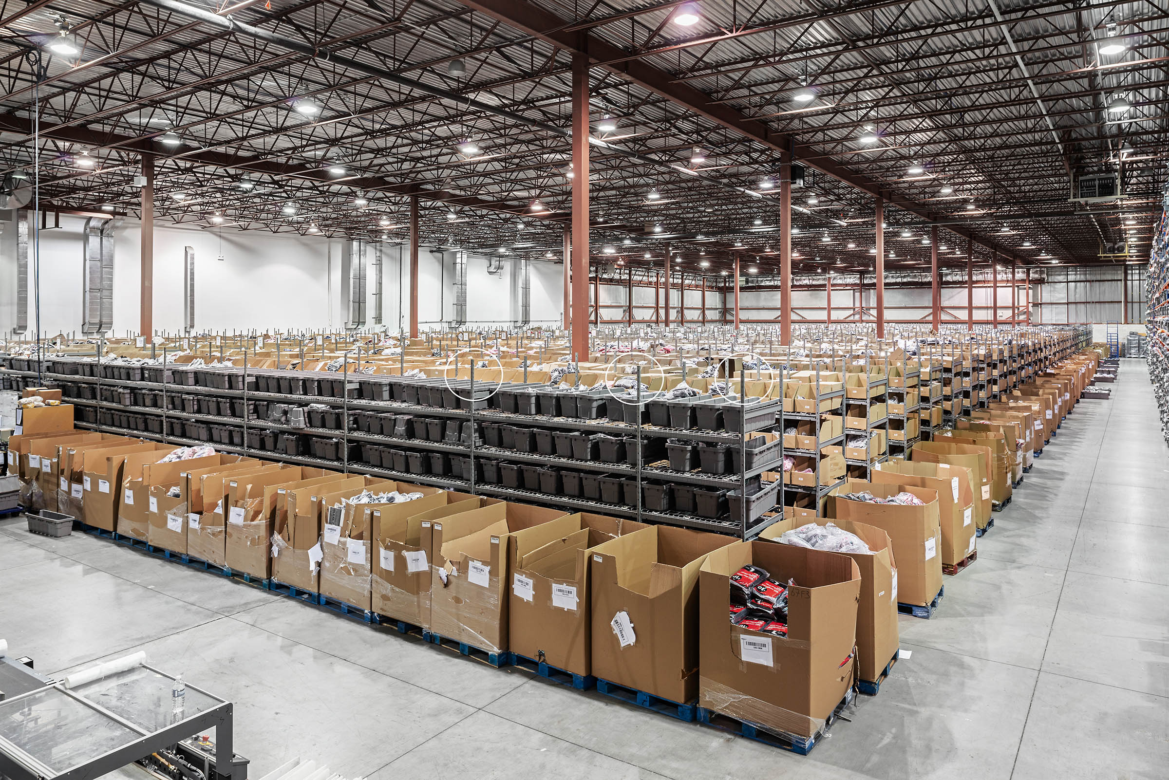 Metalware was able to recover valuable storage space by replacing existing, inefficient pallet racking with high-density, multi-level, shelf-supported storage platforms. The image to the left depicts the wasted space. The selective rack, with a combined depth of 108” (including row spacers), was replaced with a combined depth of 48” inches using back-to-back Interlok shelving. It’s no wonder this leading automotive distribution center has one of the best order fill rates in the industry.